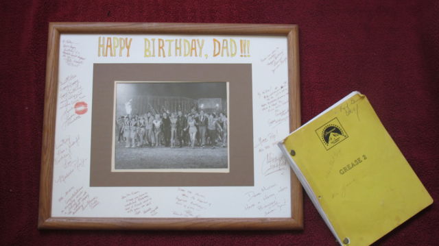 While our Grease 2 collection may not be the biggest (that honor goes to UG2VIP Grease 2 fan ,Lori B.), we’re proud of the items we’ve collected over the years. We do have an official cast/crew Letterman’s jacket with the original car & trailer Grease 2 logo on the back. We’re mighty proud of that jacket. We also have a ton of rare behind the scenes and on-set photos plus a stack of cast call sheets and a few official script revisions.